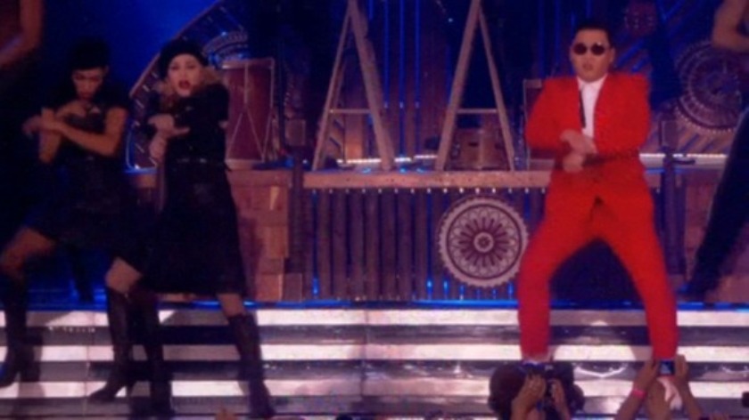Ντυμένος στα κόκκινα, ο Psy βρέθηκε στην σκηνή του Madison Square Garden στη Νέα Υόρκη, στο πλευρό της βασίλισσας της ποπ, με την τελευταία να λικνίζεται σε ρυθμούς Gangnam Style.